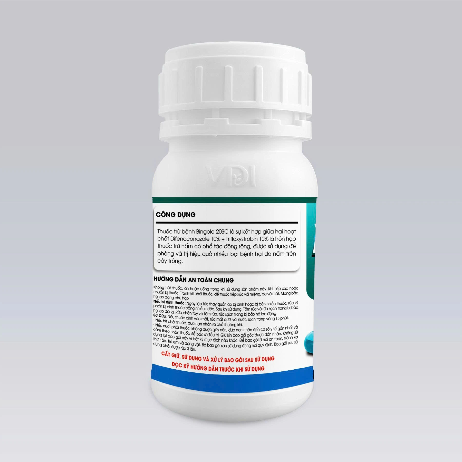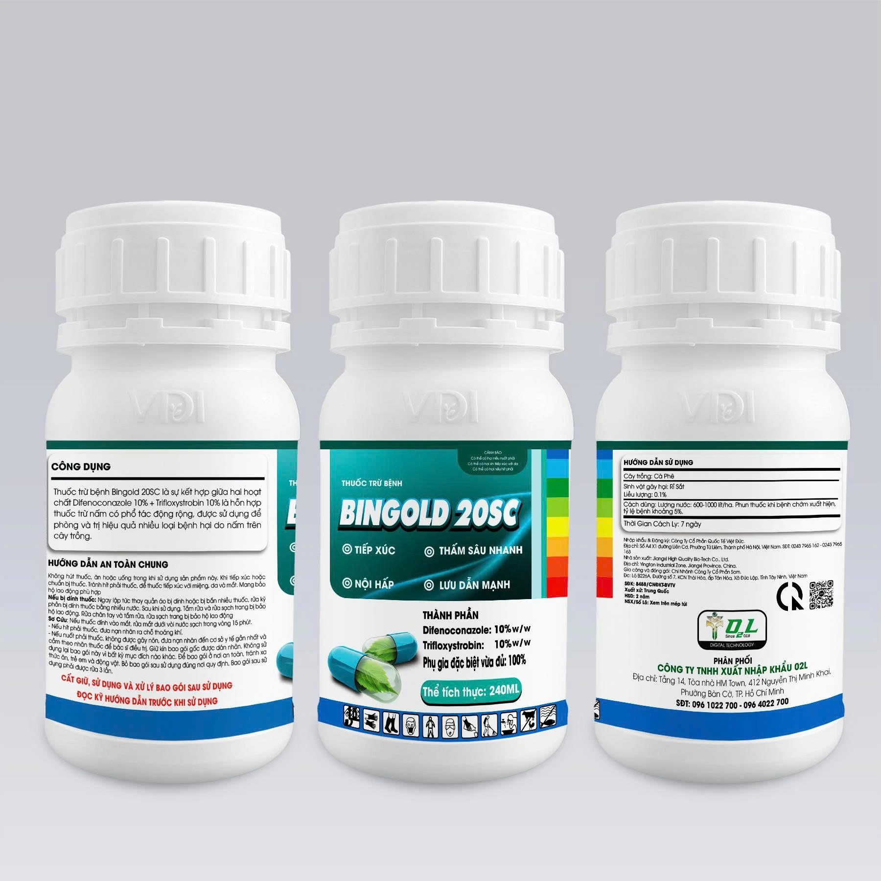 – Thuốc trừ bệnh Bingold 20SC là sự kết hợp giữa hai hoạt chất Difenoconazole 10% + Trifloxystrobin 10% là hỗn hợp thuốc trừ nấm có phổ tác động rộng, được sử dụng để phòng và trị hiệu quả nhiều loại bệnh hại do nấm trên cây trồng.