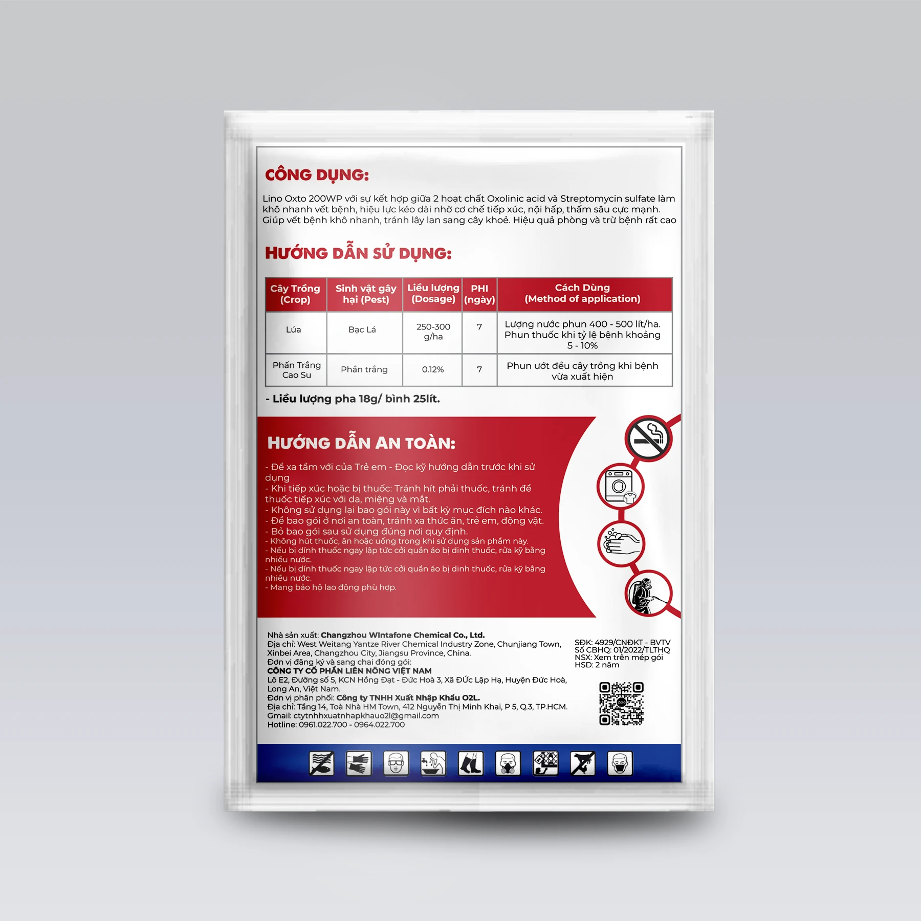 – Lino Oxto 200WP là sự kết hợp độc đáo giữa hai hoạt chất Oxolinic acid và Streptomycin sulfate làm khô nhanh vết bệnh, hiệu lực kéo dài nhờ cơ chế tiếp xúc, nội hấp, thâm sâu cực mạnh. Sau khi phun 1h gặp mưa cũng không giảm hiệu lực.
