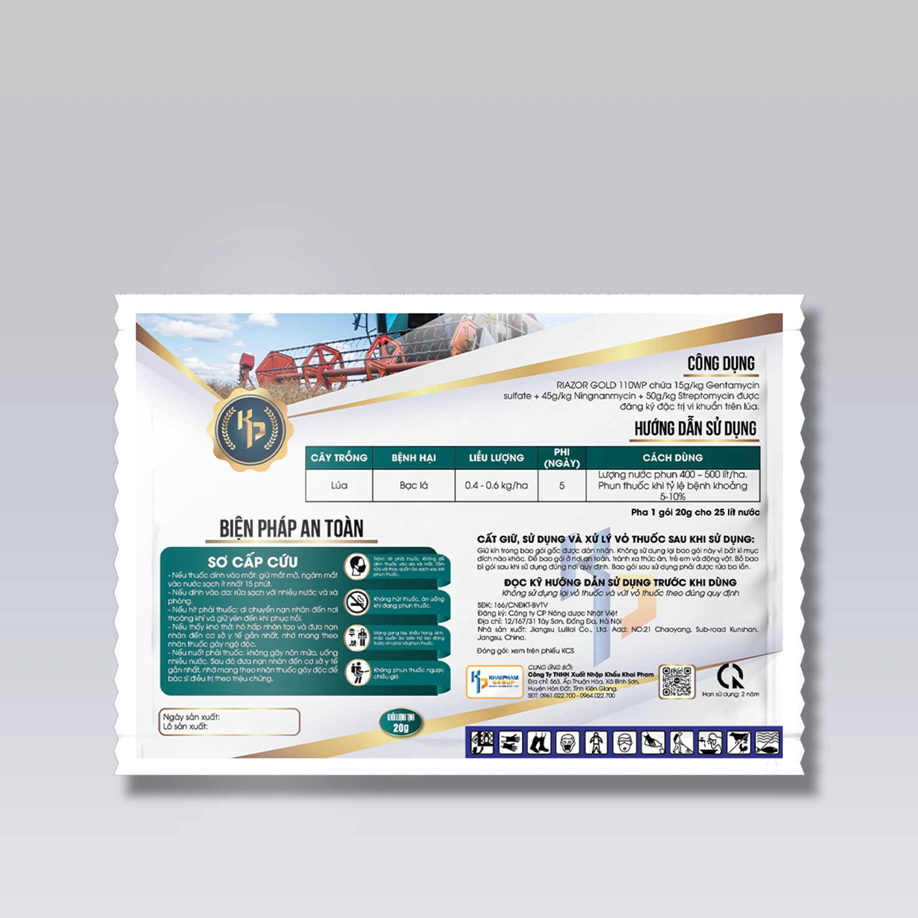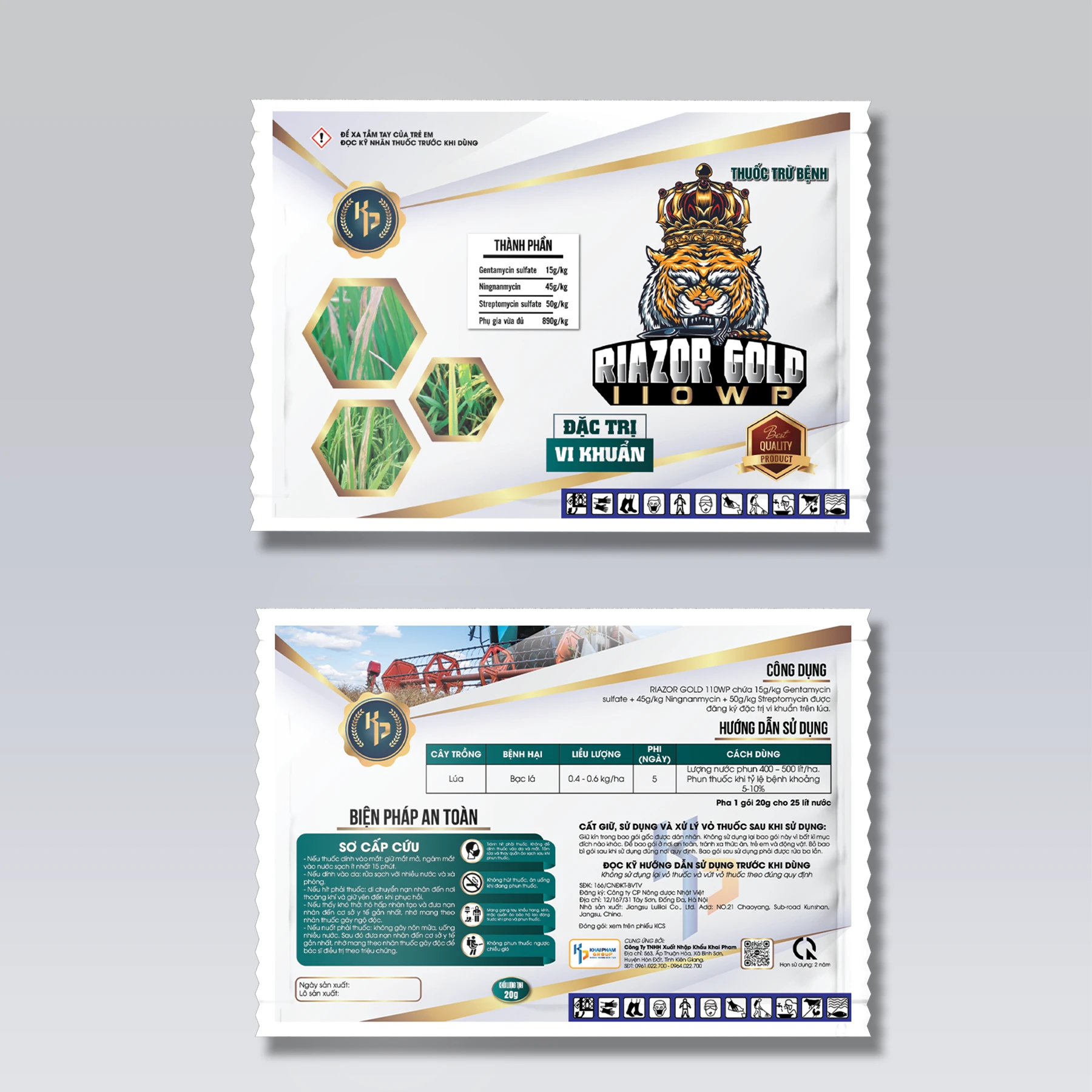Gentamycin sulfate 15g/kg, Ningnanmycin 45g/kg, Streptomycin sulfat 50g/kg, Phụ gia vừa đủ 890g/kg. Riazor Gold 110WP hiệu quả trong việc ngăn chặn sự phát triển của nấm và kiểm soát vi khuẩn gây bệnh như: Bạc lá vi khuẩn, cháy bìa lá, đốm sọc vi khuẩn, vàng lá trên lúa; thối nhũn, thối củ, héo xanh, thối thân, chết cây con, thối rễ, thối quả trên cà chua, thuốc lá, dâu tây, nho, thanh long, xoài, cam, vải, rau màu, hành, ớt, hồ tiêu, cà phê..