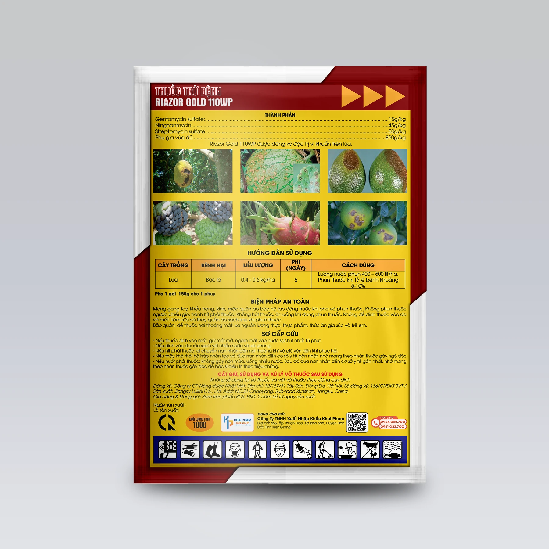 Gentamycin sulfate 15g/kg, Ningnanmycin 45g/kg, Streptomycin sulfat 50g/kg, Phụ gia vừa đủ 890g/kg. Riazor Gold 110WP hiệu quả trong việc ngăn chặn sự phát triển của nấm và kiểm soát vi khuẩn gây bệnh như: Bạc lá vi khuẩn, cháy bìa lá, đốm sọc vi khuẩn, vàng lá trên lúa; thối nhũn, thối củ, héo xanh, thối thân, chết cây con, thối rễ, thối quả trên cà chua, thuốc lá, dâu tây, nho, thanh long, xoài, cam, vải, rau màu, hành, ớt, hồ tiêu, cà phê.